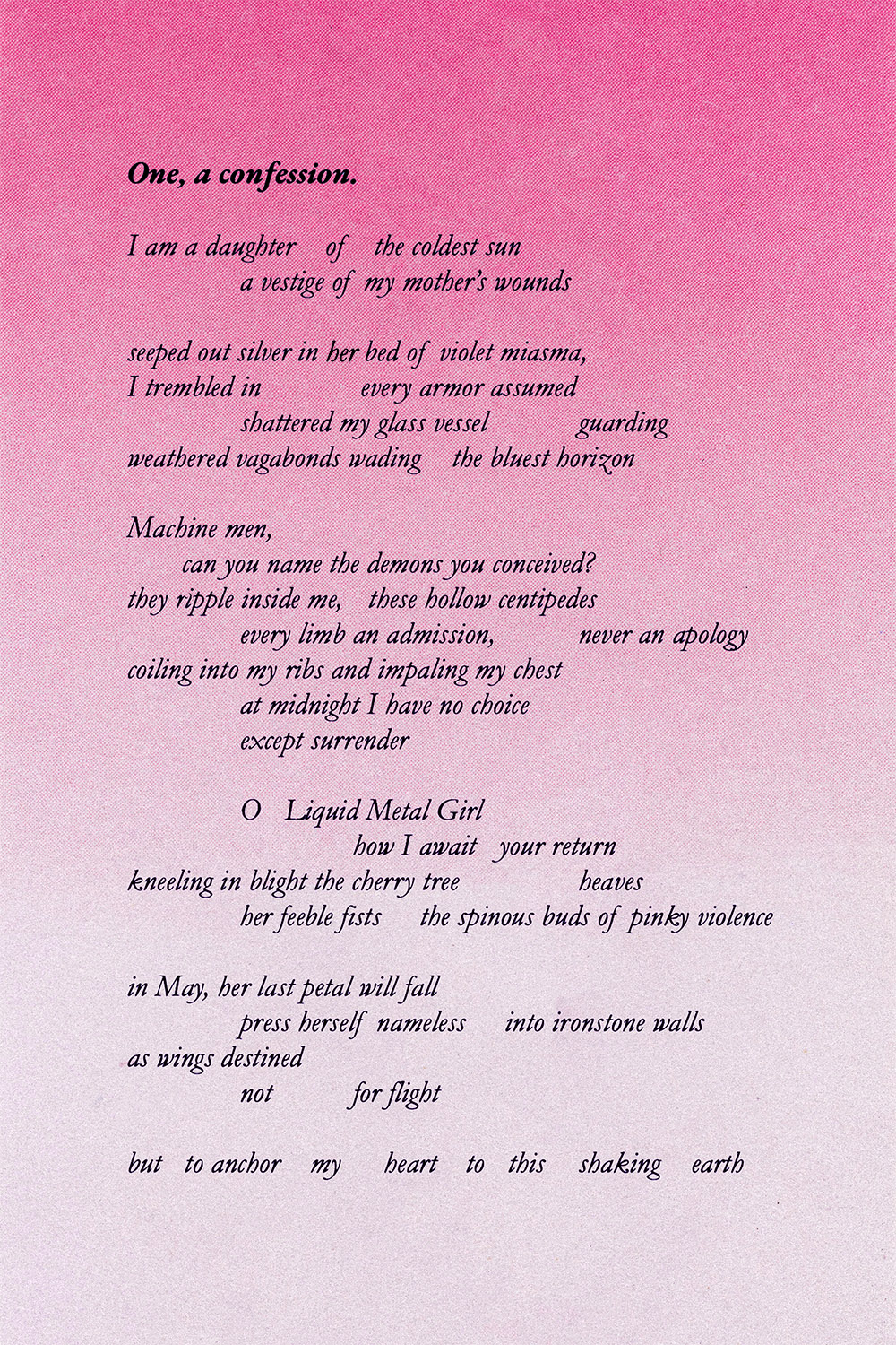 O Liquid Metal Girl // how I await your return // kneeling in blight the cherry tree heaves // her feeble fists, the spinous buds of pinky violence // in May, her last petal will fall // press herself nameless into ironstone walls // as wings destined not for flight // but to anchor my heart to this shaking earth
